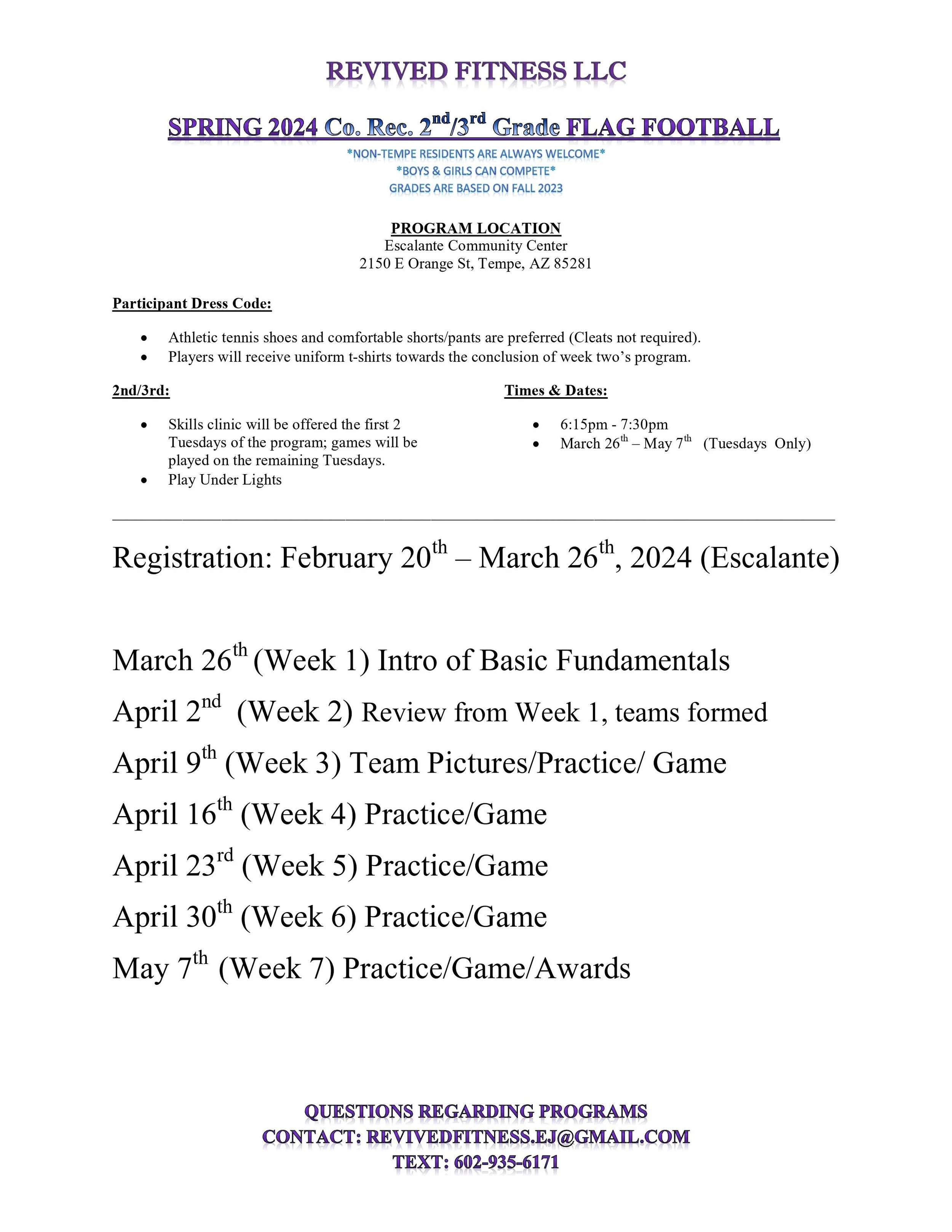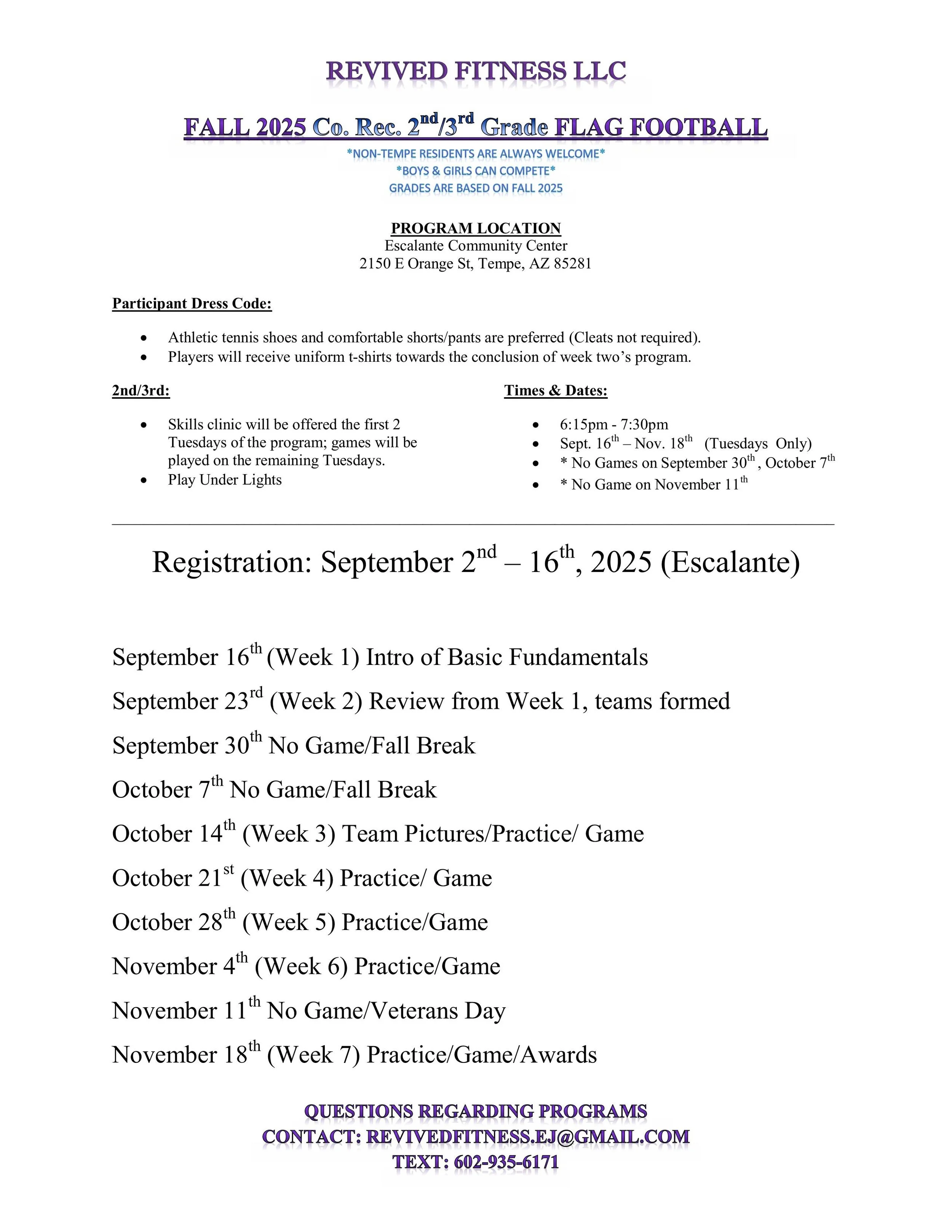 Revived Fitness will have a table and be informing parents about our upcoming Flag Football Season. We will also have a football toss game set up with prizes! Make sure to signup for the Future Registration Reminder. We will give you a call on September 5th, 2023 when registration is open.