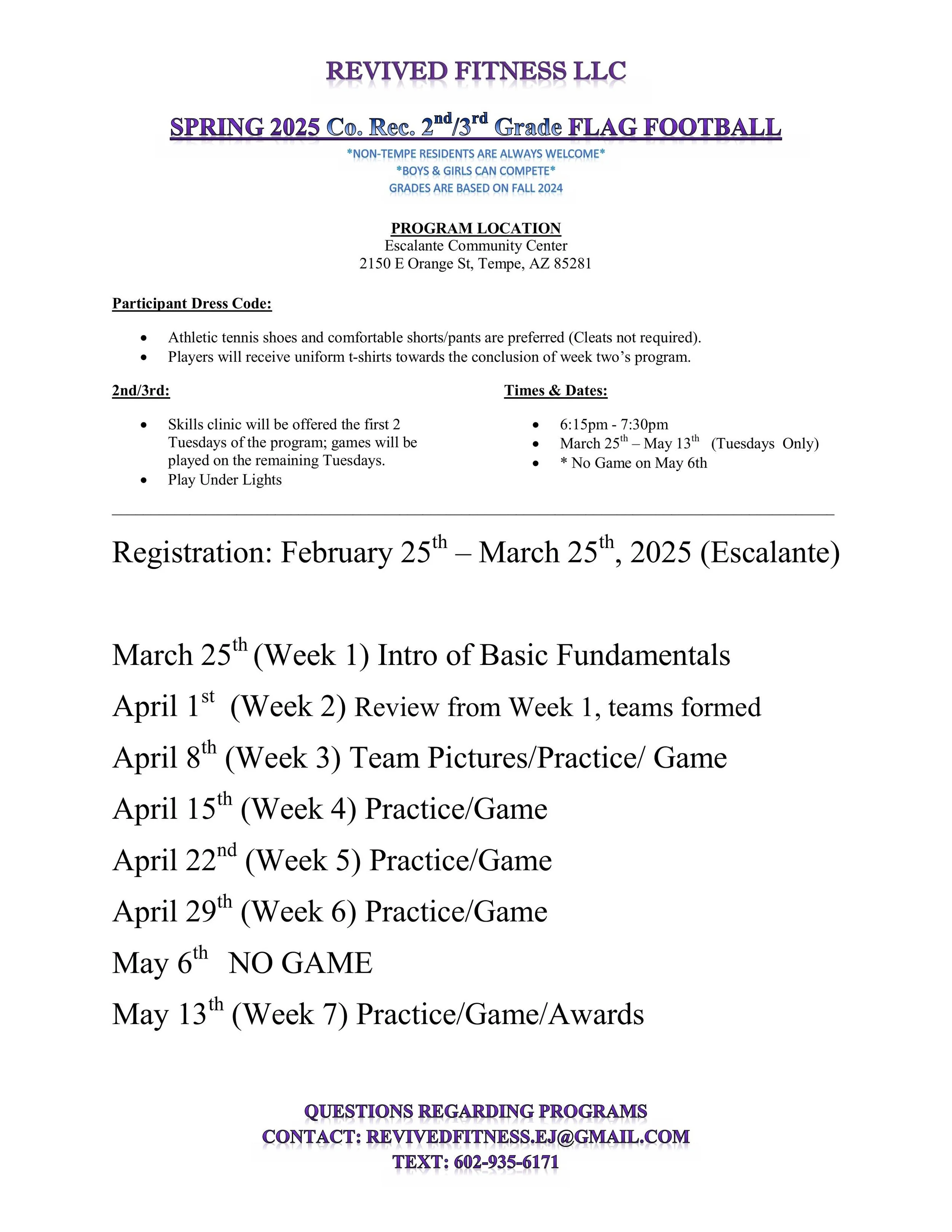 Flag Football; Revived Fitness Co. Rec.Leagues; Grades 2-3